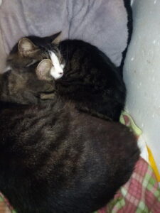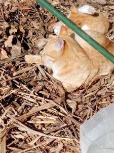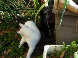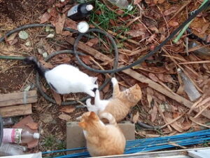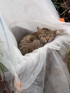 外猫さんの小屋のビニールパッカーを留める支柱が西風で煽られたので、もう一度打ち直し、😸達は一旦現場からは退きますが、私が何をしているのか理解している様子でした。150㎝の支柱を横木にして雨どいに軽く留め、パッカーもし直して終了。もう一本150㎝の支柱を更に上に括り付けたいですね。そうすれば雨雪などの吹き込みも違います。確認しに行ったら、多分今のままでOKかも。脇に垂直な支柱を立ててクロスバンドで留めたので、煽りで動く事は改善されそうです。猫達が不織布が好きなようなので、今度は不使用の不織布を突っ込む事にします。
