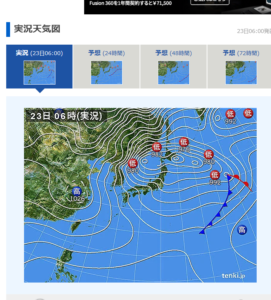 風が本当に強いし、時折突風になります。庭に敷いた落ち葉が煽られて飛んでいく~!ま、それも自然なのでしょう。今日の天気図はこんなです。房総のはるか沖に前線を伴った低気圧。それ以外に、まるで雷様の太鼓みたいに弧をなして4つの低気圧、つまり合計5つの低気圧に日本は囲まれています。西隣さんの椅子がひっくり帰りました。西南西の風をもろに受けたのでしょう。