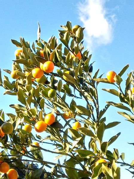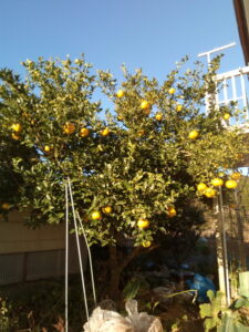 我が家の夏蜜柑は20-25年前に山口県か広島県の物を取り寄せたものの種から育てました。確か7本位発芽し、最終的に残ったのはこの一本でした。蜜柑の生長は20年近くかかるらしく、私が定住を決めた2015年が丁度その年であった様で一氣に花が着き、結果しましたが、その時は10個くらいだった、と記憶しています。未だ私もミカンの味が分からなかった頃で盛んにマーマレードジャムなどを作ったりしていました。2-3週間前に落ちた果実の皮が柔らかくなったので、今朝試しに食べてみました。酸味が勝っていますが、鋭い酸味ではありませんでした。甘いお菓子と合わせて頂くとバランスが取れるかなぁ。サラダに果肉を大きく解して入れるのも美味しいかも知れません。
