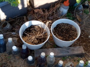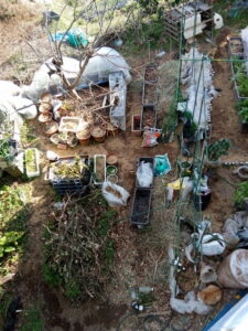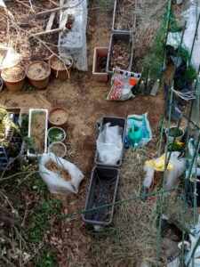 数日前にお隣のおじちゃんが刈り払い器を掛けた草を貰って来ました。二畝東側にドサッと置きました。中々落ち葉の吹き溜まりも住宅街では見つからないですね。