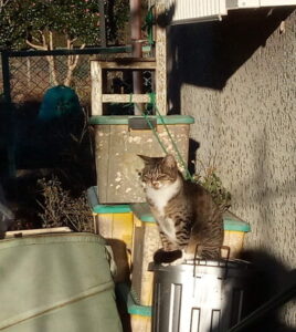 掘立小屋のビニールの向こうではクロスケ、曲がり君、はっちゃんが遊んでいます。右は日向ぼっこのうめ婆ちゃんです。『失礼ね、未だ三歳よ!』