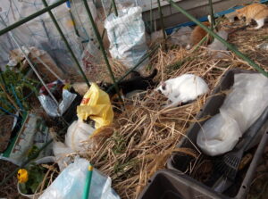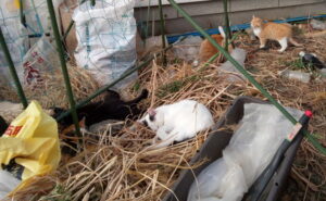 新しい草を置いたら、さっそく外猫さん達が寝心地を試していました。