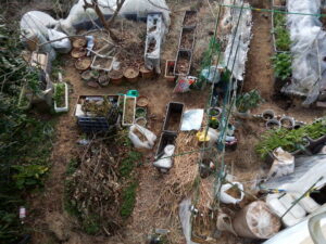 ほぼ2時間の草拾いと通路へ草置き。笑 第一堆肥枠の周りと写真右下の部分、二畝の南通路東側に拾った草を敷き詰めました。小さい草は風でも飛びにくいのですよね。二畝南の西側も不織布と土の間に乾いた刈草を敷きました。放線菌かな?コロニーが出来ていましたが、寒縮小松菜の発芽は未だでしたね。後は縦横の中央通路にも敷いて行きます。籾殻との違いは草の方が空気が間に入りやすい点でしょうか。
