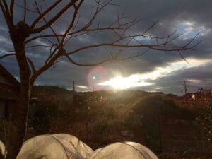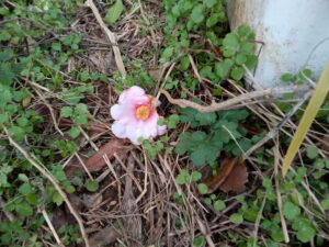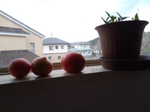 一袋弱だけど、草を集めて来ました。一番大きなカラーさんの周りに置きました。写真はピンクの椿です。侘び椿とは色が薄目で綺麗な形です。今朝は雲が覆っているから寒いです。雲の合間から太陽の光が差しました。右は12月に収穫したトマト(強力米寿)です。青いまま大きくなってきたので取り敢えず収穫して窓辺に置いたら一週間くらい前から急に赤くなりました。種取りが出来れば、このままペットボトルに埋めてみます。