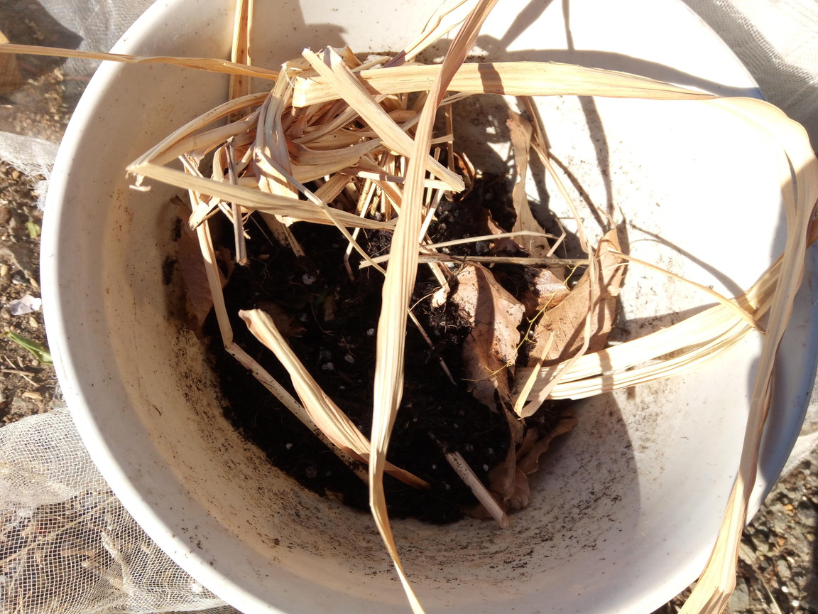 落ち葉と萱を鉢底石の上に置き、今までの鉢土のままの日日草を置き、周りの空間に溝の土(30年以上のもの)を入れました。