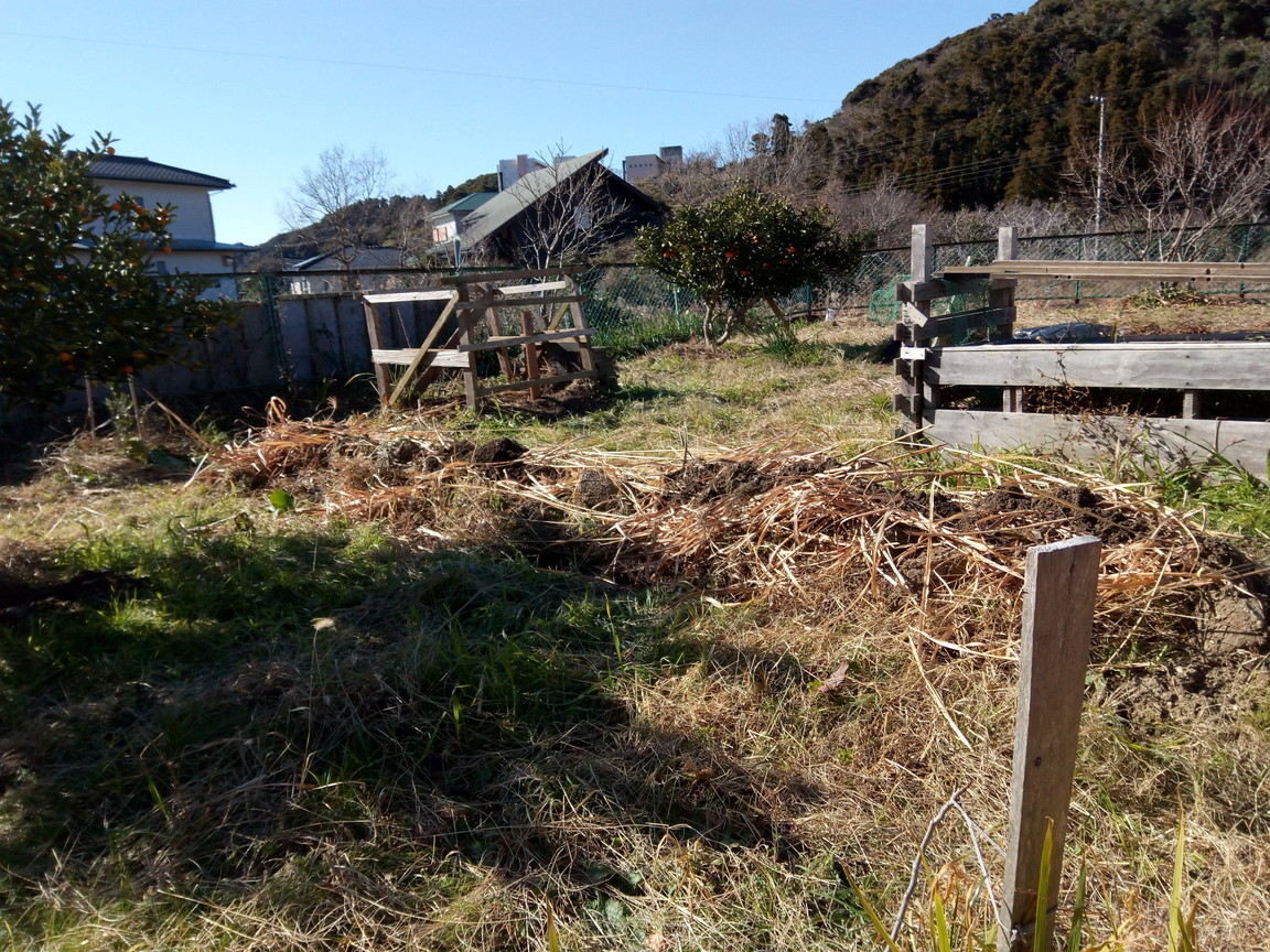 一見、泥の量が少ないように見えますが、実際には30-40㎏の土が萱の上に乗せてあります。さらにセイタカアワダチソウをびっしり乗せるつもりです。徐々に暖かくなり青草が芽生えて来ますが、只管乗せ続けます。それで秋―冬にかけてどのような成果が出るか、楽しみです。
