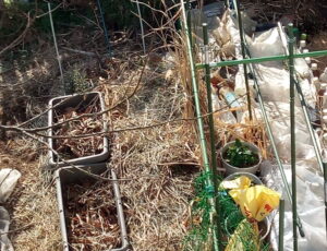 右: 真ん中の支柱の先の方で立っているのはカマキリさんの卵、多分10個位、に萱を防寒で周りに巻き付けたものです。真ん中のパンジーの花は鳥の悪戯か、花が2鉢ともなくなっていました。あれっ!?鮮やかな紫の花もない!ヒヨドリさんですか~?犯鳥は。