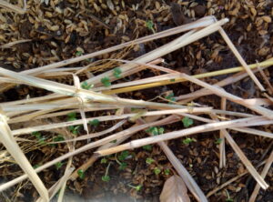 二畝の寒縮小松菜です。写真の刈草は前回放線菌のコロニーが出来た時に入れたものです。