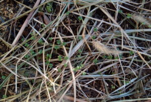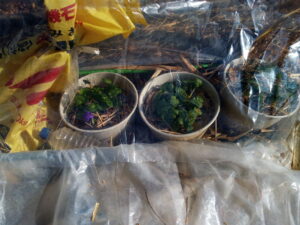さて、どうしようか、と考えましたが、今橋流で乾燥した草を持って来ました。細かく切ったものを使おうか、と悩みましたが、空間を作るためにはある程度大きいまま入れた方が良さそうだ、と思い、ドライな刈草を敷きました。不織布を掛けその上に二重ビニールを掛けて、特に風対策はしていません。風が強い日は泥でも少量載せる事にしましょうか。ボトルのような固形のものは置きたくないですね。