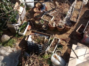 左: 中央に鰹や鮪のトロ箱が二つあります。トロ箱は保温などで特に冬―春先は凄く植物の生長が良い反面、土の量が限られるため初期生育に比べ中盤から全く育たなくなるのは土の量のせいなんですね。私も氣になっては居た蕪のトロ箱の生長。韮のトロ箱の生長。思い切って底を抜いてみました。勿論、底面に当たる土は耕して蕗の根などは取り払いました。上から水遣りをしておきましたが、どうなるでしょうね。次回は最初から底を抜いて段ボールを土と接する面に敷いて土入れをしてみたい、と思います。できれば底下は落ち葉堆肥などの床堆肥をしてみたいです。大蒜のプランターには落ち葉、萱などを詰め込みました。どんどん足して行きます。