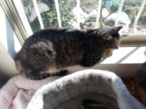 タイガーさんは私の布団の上で寝ていました。私の毛糸の襟布が氣に入って、そこで寝る!いや、だめだ!と私と攻防戦があり、布団の上に落ち着かざるを得なかったのですが、7㎏ぐらいある重い体は布団の下からもズッシリ、と感じました。絶対、7㎏位はあるよね。