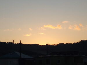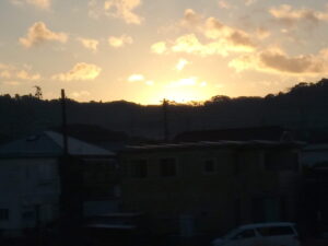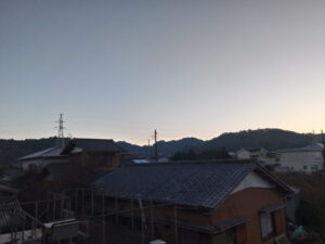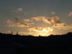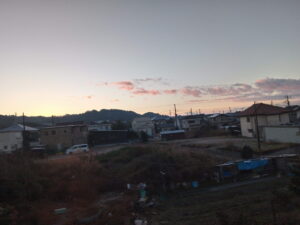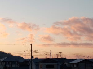 もうじき海岸の山の上にお天道様が現れますよ~。雲が茜色で綺麗です。