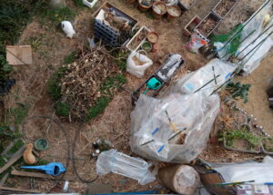 右: 今晩からの雨に備えて古いユーラックで外猫サンルームをグルグル巻きにしました。
