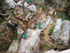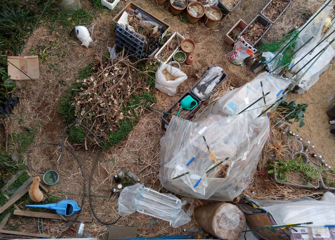 右: 通路に使っていないさんさんネットを置いているのは外猫さんたちが氣に入っているみたいだからです。寒い季節は地面からヒンヤリするものが上がって来るのでしょう。
