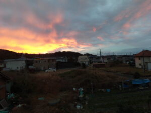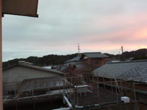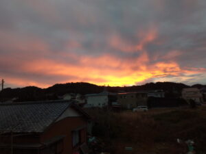 えっ!?雨戸を開けて驚いた今日の朝焼け。7時前です。こりゃぁ、荒れますね。