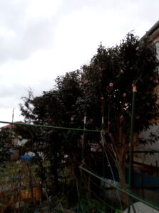 右: 暗いので見難いですが、ピンクの椿は木の天辺まで開花が進みました。どちらの木も花芽が出来る時期に明るい光を浴びる事が出来たので、花の数が違いますね。侘び椿も今までになく花が多かったです。