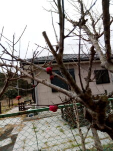 福と一緒に梅木を見ていたら、西隣さんの庭の、温州さんの近くで大きなヒヨドリさんの声!近づいてみたけれど、ダンマリを決め込んでました。1m位まで近づいたら、農道の方のヒヨドリが騒いで、温州さんの中から2羽のヒヨドリが飛び出しました。笑