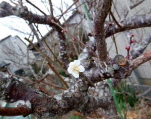 左: ボケボケパラダイスですが、昨日咲いた実梅の第一花。