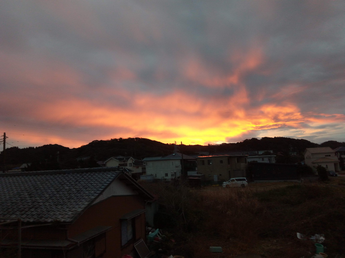 雨戸を開けると驚いた。赤い光が目に飛び込んできた。昨日の荒天を予想するかのような、一寸見ない激しい朝焼けの色でした。