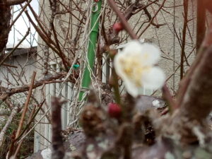 左: ボケボケパラダイスですが、昨日咲いた実梅の第一花。