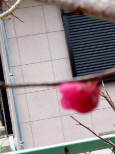 右: 暗いので見難いですが、ピンクの椿は木の天辺まで開花が進みました。どちらの木も花芽が出来る時期に明るい光を浴びる事が出来たので、花の数が違いますね。侘び椿も今までになく花が多かったです。