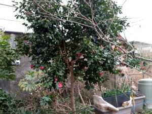 地上から1.3m位の処までは既に花が咲いています。東の日差しが届くようになって初めての椿の開花はやはり花数が違いますね。上の方まで蕾がびっしり着いています。ジベレリンやアセチレン等が上がっていくとどんどん花が咲きます。この椿はそれが分かりやすいです。この椿は日本画に出てくるような形の良い花が咲きます。マンションの垣根の植栽だったのであまり氣にも止めていませんでしたが、なかなか良い木です。椿ですから流石に背が高くなりますね。去年、ユンボが主枝を折ってしまいましたが、芯止めになったのかもしれません。もともとは刈りこまれて1.5m位になっていた木です。