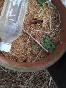 左: 5号駄温鉢を被せてキョンから守っていたチューリップ、今年は花は咲かせません。