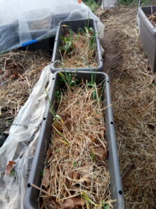 左: 一番先に植えた大蒜です。落ち葉と萱などを足して上げないと。