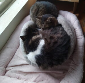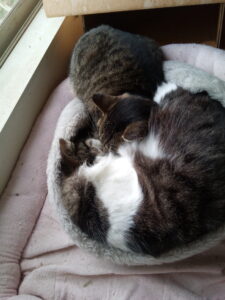 『ねぇ、福ちゃん、温まらせて~!』『良いよ。』『三猫、夜は四猫になるんだからもう一つ二つベッドが欲しいわよね。』『そうだにゃ。お母さんに提案してみようよ。』