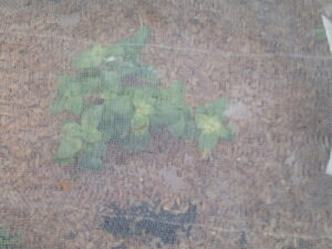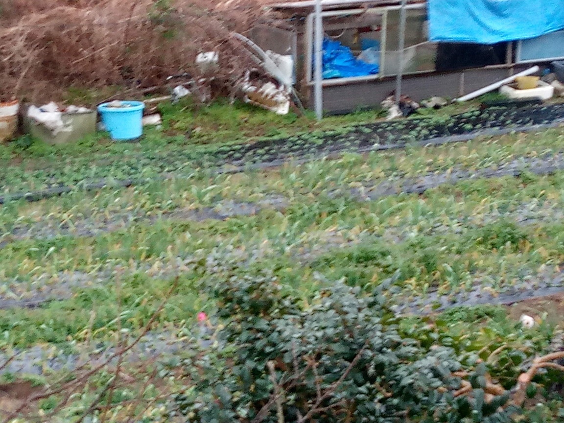 左: 一番先に植えた大蒜です。落ち葉と萱などを足して上げないと。