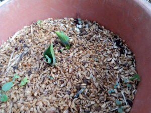 左: 5号駄温鉢を被せてキョンから守っていたチューリップ、今年は花は咲かせません。
