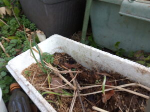 左: 先日底を抜いた韮のプランター。