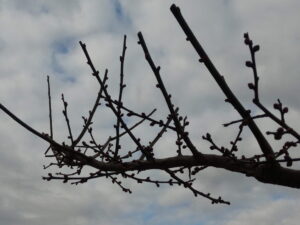 左: 玄関前の梅の枝。蕾が膨らんで来ました。後10日位かしらねぇ。