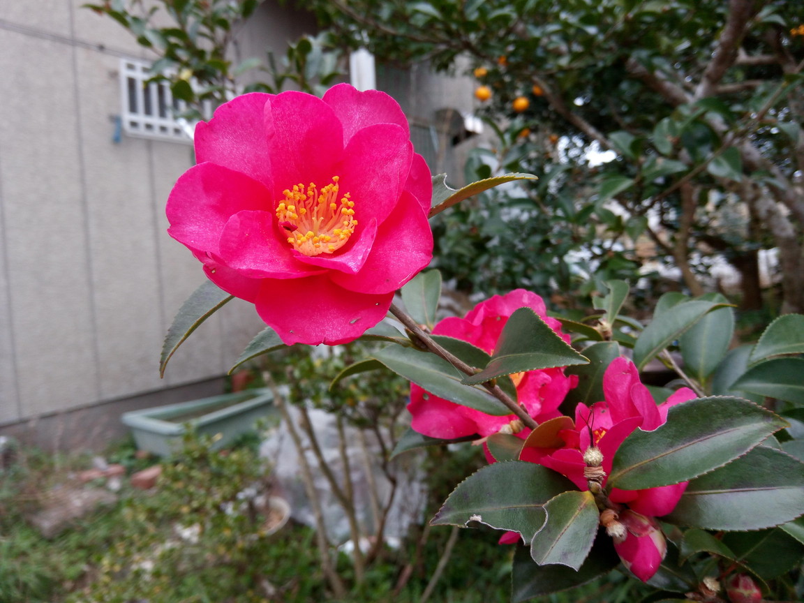 中: う~ん、分かりにくいですが左の椿は開花がどんどん進んでいます。東の光は浴びたことがありませんから、うれしくて!