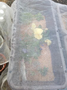 玄関アプローチのパンジーです。綺麗に咲いていますが、キョンがウロチョロするのでネットは外せません。
