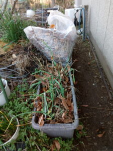 落ち葉を拾いに行こう。拾って来た落ち葉は籾殻袋一杯分。これを玄関脇の大蒜のプランター等へ。