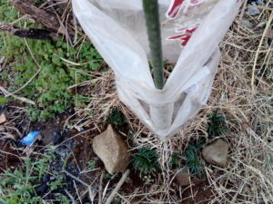 左: 金柑苗を先日植えましたが、玉竜を回りに植え付けました。リビングマルチです。