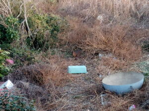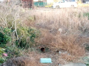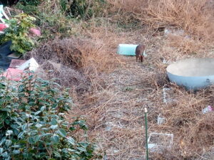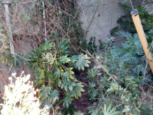 写真右はおたふくさんの敷地だけどキョンの巣になっていたので、八手その他をのこぎりで切り倒しました。大きな八手だったので、生えているみたいに見えますが、倒しました。