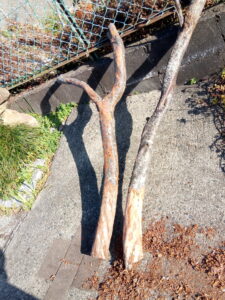 左: Sさんの処から伐採した木…頂くと言った私の3年越しのお約束を果たしました。下30㎝はモルタルに触れるので、皮は比較的丁寧に剥いていますが、上は猫達の爪研ぎ用なのであまり剥きません。皮は後でお魚を焼くときに使います。