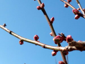 I さんの畑の梅は2-3年前に出て来た新枝が花を着けました。低い位置にある枝から咲いて行くので、古い枝にホルモンがいきわたるのは1-2週間かかるのでしょうか。白い花びらが優しいです。我が家の鹿児島紅もちらほら咲き始めました。実梅の蕾は毎日膨らんでいますよ。