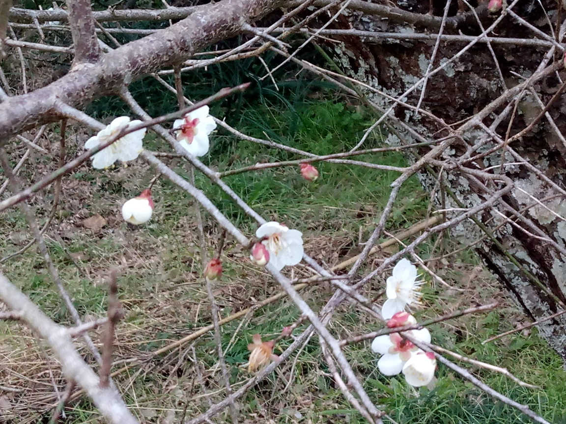 今年の早春は雨が多いの?梅の花が下を向いているものが多い…。