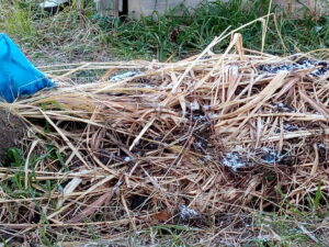 右: 西隣さんの蚕豆が並んでいます。草の覆いが多い処は軽く持ち上げて置きました。でも、まだ寒いから軽く空気を通すだけね。
