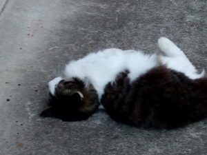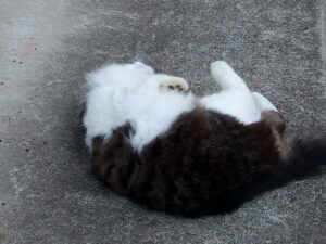 庭のサンルームに戻って覗き込むとクロスケは猫団子をしていました。一安心。もしかしてお父さん猫が同じ?Aさんのお宅の外猫さんかしら?