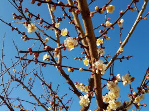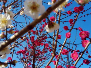 こちらは一昨年の二月上旬、初めて木全体に花を着けた時の鹿児島紅と実梅です。