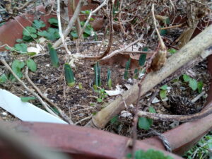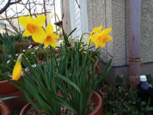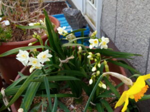 玄関の前では隣り合った鉢で黄色のラッパ水仙が発芽しています。右の写真は今日撮りました。去年も同じ様に隣り合わせで遅れて発芽しましたが、先に咲いたのは後発で発芽した黄色い水仙でした。笑