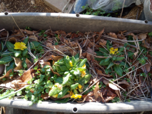 左: ジュリアンが落ち葉だらけ、枯れ草だらけの中で花を着け始めました。