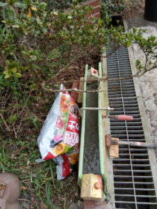 8時6分に更新してから土留めの型枠を2つ段ボールで作りました。一つでバラスがなくなりました。インスタントセメントもほぼなくなりました。お昼前はご近所のWさんに何をやっているかお見せしながら手を止めずにお喋りを楽しんでいました。お昼の月の砂漠を過ぎて彼女が帰宅され、それから二杯分詰めていた所で、呆れたうめが「オカアシャン、いい加減にして!私のお昼と自分のお昼ご飯ですよ!」、と文句を言いに来ました。笑笑