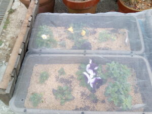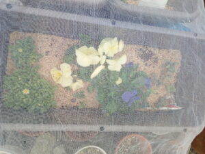 中&右: ネットが掛かっているので氣が付かず、いつの間にか満開になっていたパンジーたち。