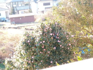 物干しから見た、南西側ピンクの椿は天辺まで花が一杯です。東の椿も満開です。