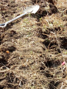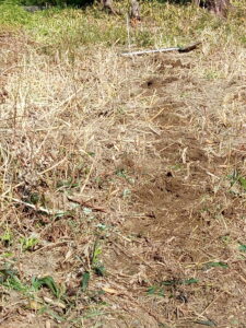 休憩後はスコップで全面ホップです。後で進捗状況が分かる様に写真を撮って置こう。先ずは何㎝の深さまで掘れるかが問題ですが、丸太を埋めて萱や草を入れて丸太の外側に溝を掘った土を草の上にかけて畝とします。